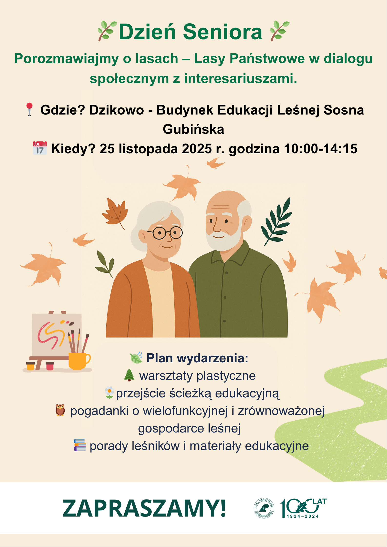 Nadleśnictwo Gubin serdecznie zaprasza Seniorów na obchody Dnia Seniora, które odbędą się 25 listopada 2025 r. (wtorek) o godz. 10:00 w Budynek Edukacji Leśnej „Sosna Gubińska” w Dzikowie.