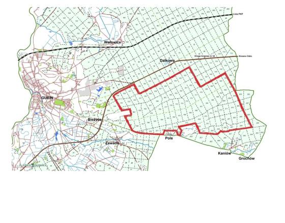 - na północ od drogi powiatowej nr 1139F (Gubin – Pole – Kaniów – Grochów – Wełmice)